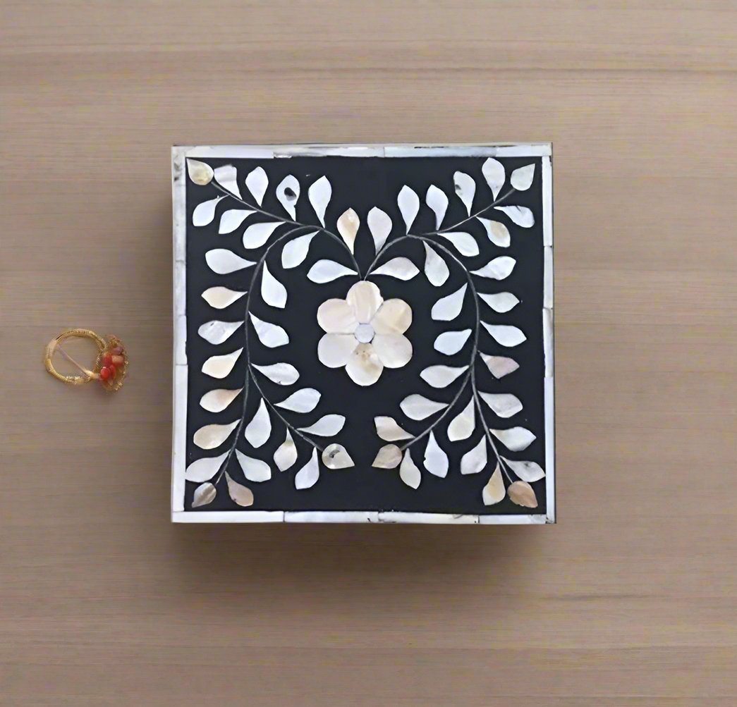 - This stunning Black Mother of Pearl Inlay Box is perfect to store your beautiful jewelry pieces or your essentials into this box. The intricate floral pattern carved from mop, creates a beautiful contrast against the black resin.