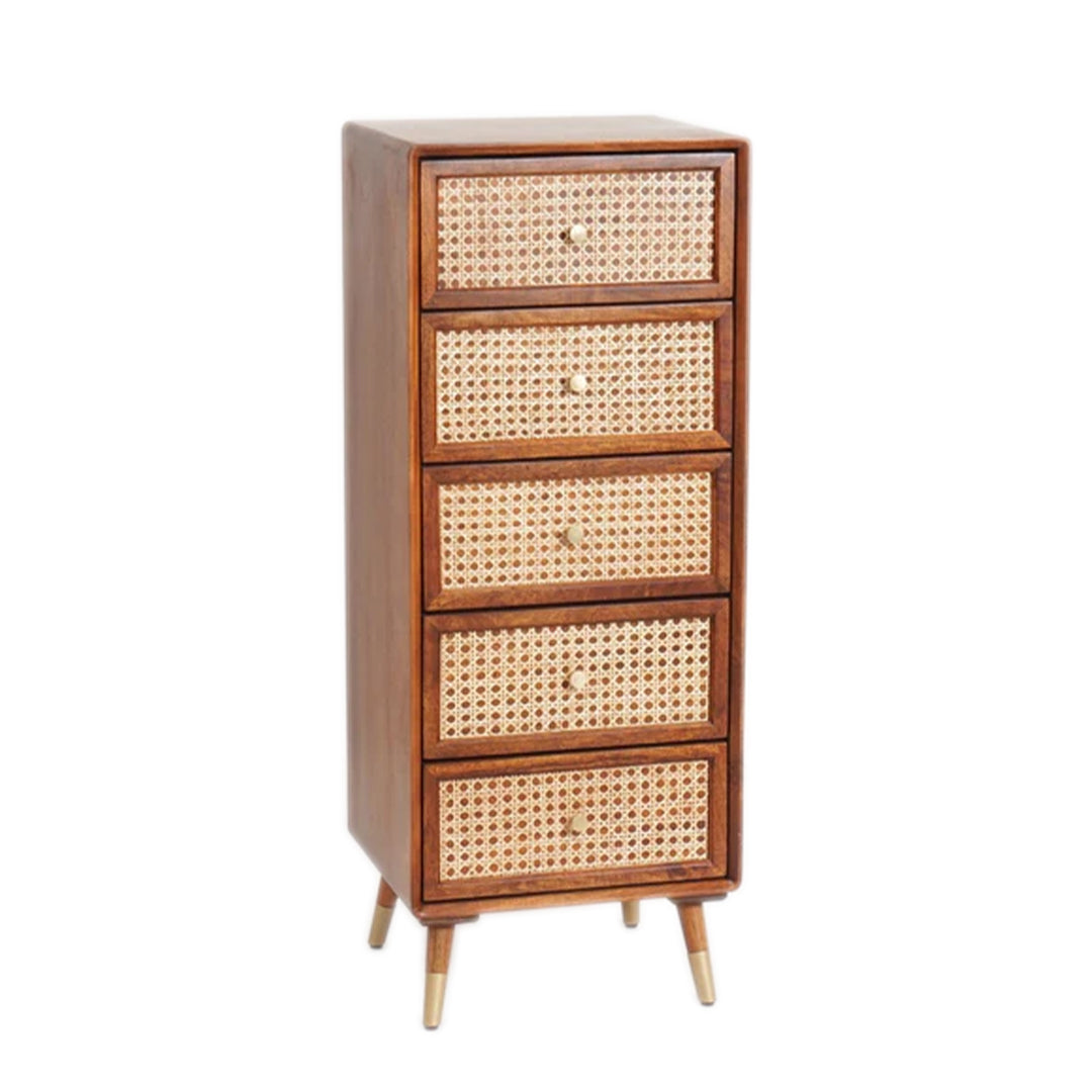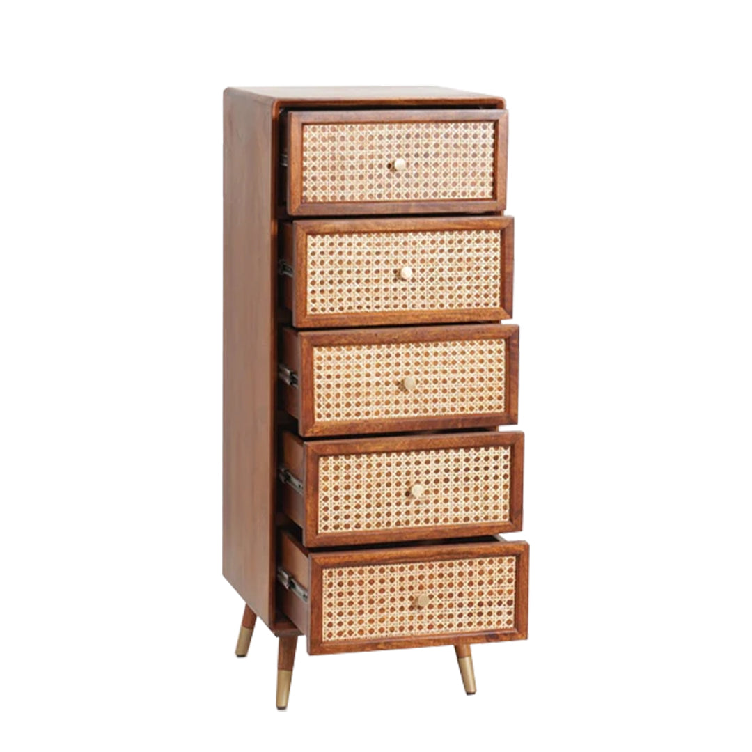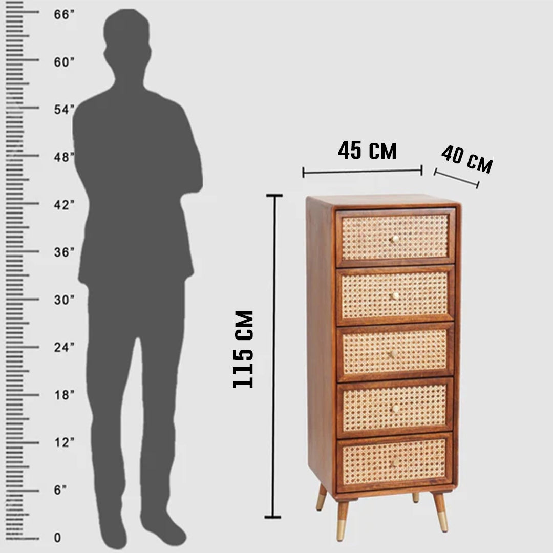 Indulge in the timeless elegance of this handcrafted wooden chest/Tall Boy Dresser, adorned with exquisite cane work meticulously crafted by skilled artisans of Rajasthan. With Five spacious drawers, this chest offers both functionality and beauty, providing a complete storage solution for your home. Its intricate design adds an aesthetic charm to any space, lending a touch of traditional craftsmanship to modern interiors. Each detail is carefully curated, reflecting the rich heritage and artistry of Rajasthan. Embrace the warmth of natural wood and the intricate patterns of cane work, creating a captivating centerpiece that effortlessly combines form and function.