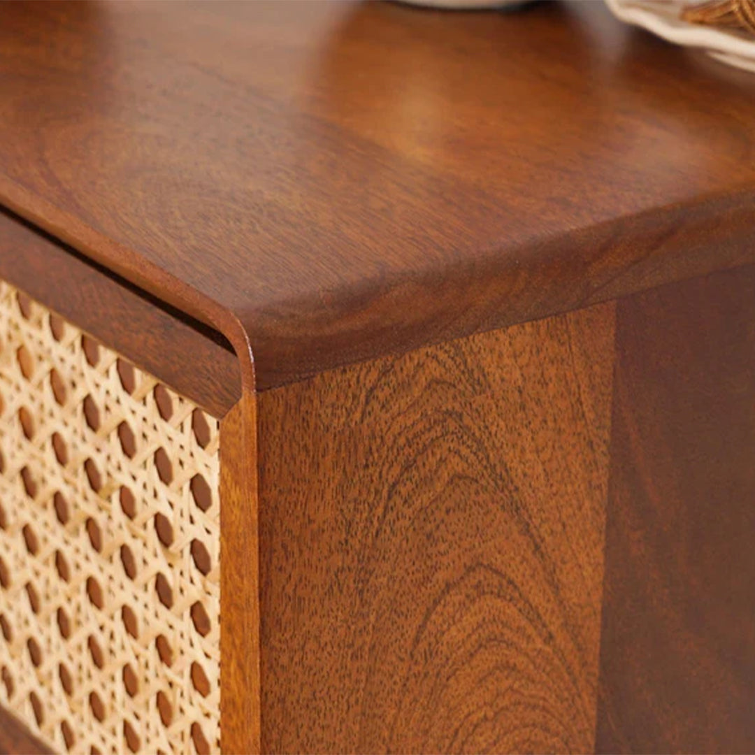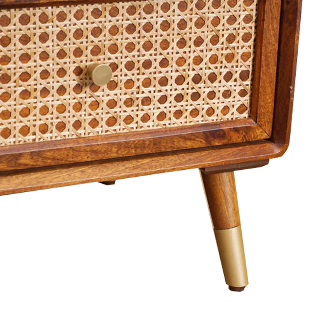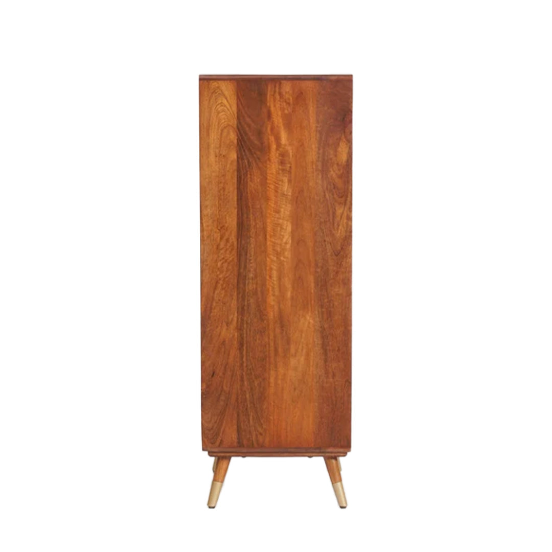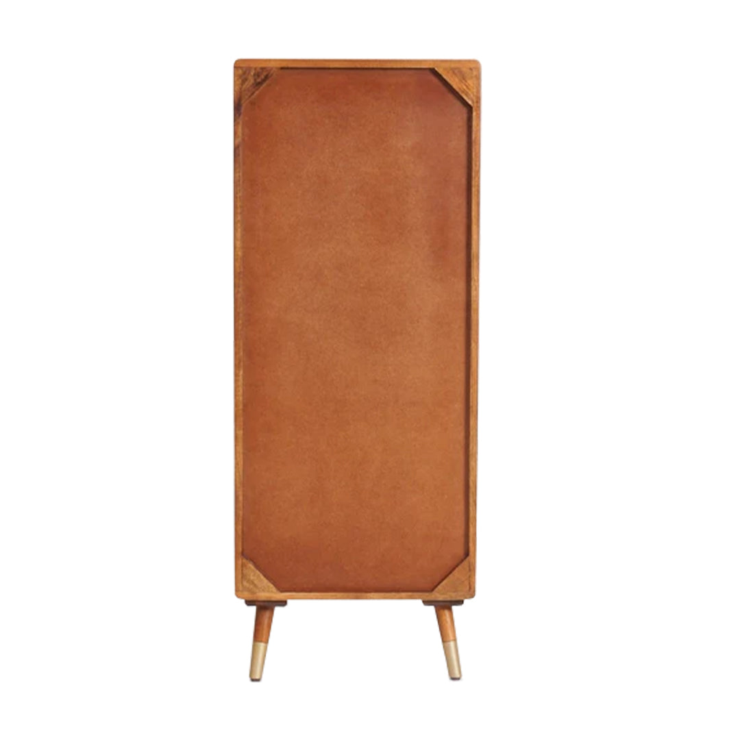 Indulge in the timeless elegance of this handcrafted wooden chest/Tall Boy Dresser, adorned with exquisite cane work meticulously crafted by skilled artisans of Rajasthan. With Five spacious drawers, this chest offers both functionality and beauty, providing a complete storage solution for your home. Its intricate design adds an aesthetic charm to any space, lending a touch of traditional craftsmanship to modern interiors. Each detail is carefully curated, reflecting the rich heritage and artistry of Rajasthan. Embrace the warmth of natural wood and the intricate patterns of cane work, creating a captivating centerpiece that effortlessly combines form and function.
