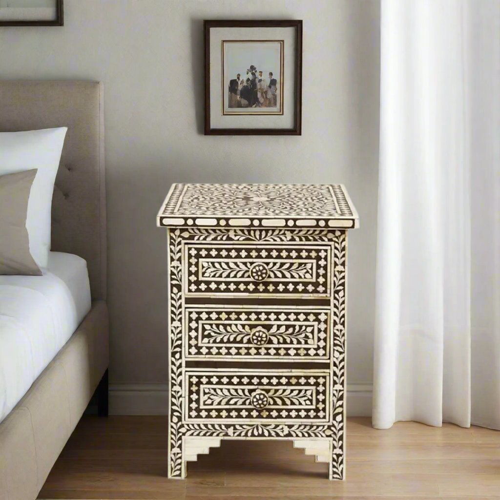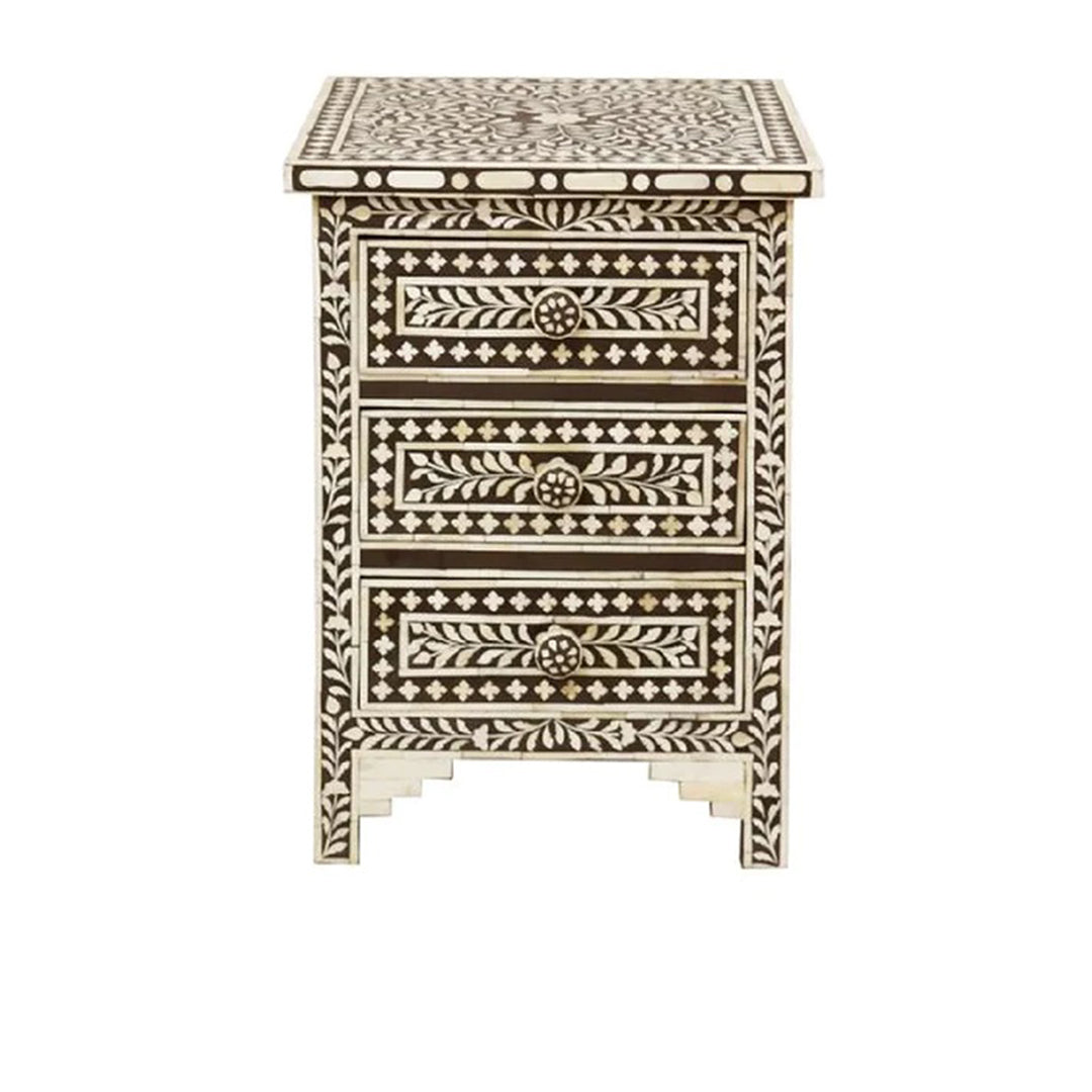 # The elegant Brown Floral Pattern on this Bone Inlay Nightstand is beautifully made and completely handcrafted by our skilled artisans. Please note that each of these exclusive pieces is slightly different and the result of many man hours of craftsmanship. The three drawers give ample space for storage.