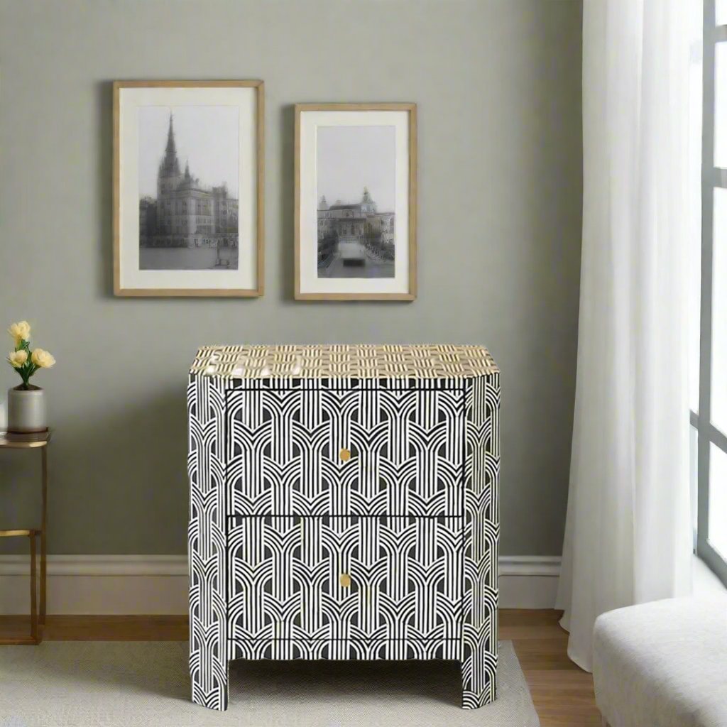 Handmade Geometric Pattern Bone Inlay Bedside Table - Black