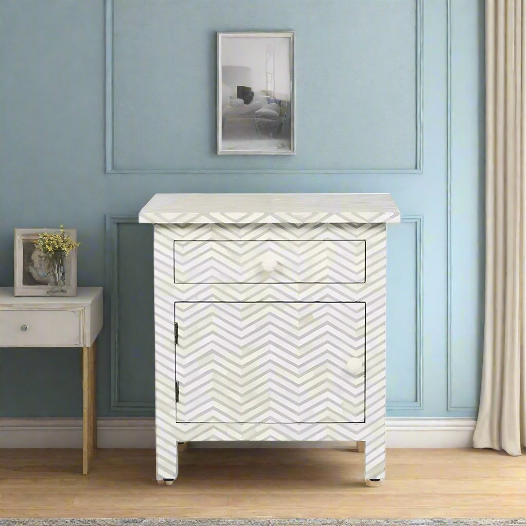 # The elegant Geometric Chevron Pattern on this Bone Inlay Nightstand is beautifully made and completely handcrafted by our skilled artisans. Please note that each of these exclusive pieces is slightly different and the result of many man hours of craftsmanship. The one drawer and one shelf gives ample space for storage.
