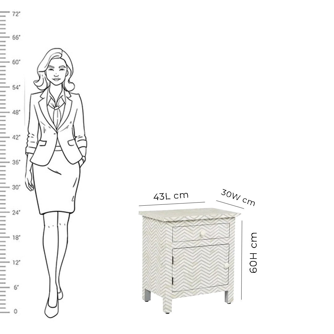 An elegantly made Handmade Bone Inlay Nightstand will not only gives your bedroom an elegant feel to your bedroom but also adds as utility to keep your essential items without any hassle. This Bone Inlay Chevron Pattern Grey Nightstand Table is beautifully crafted by individually carving bones and binding them into a colorful Resin structured in a solid wooden frame.