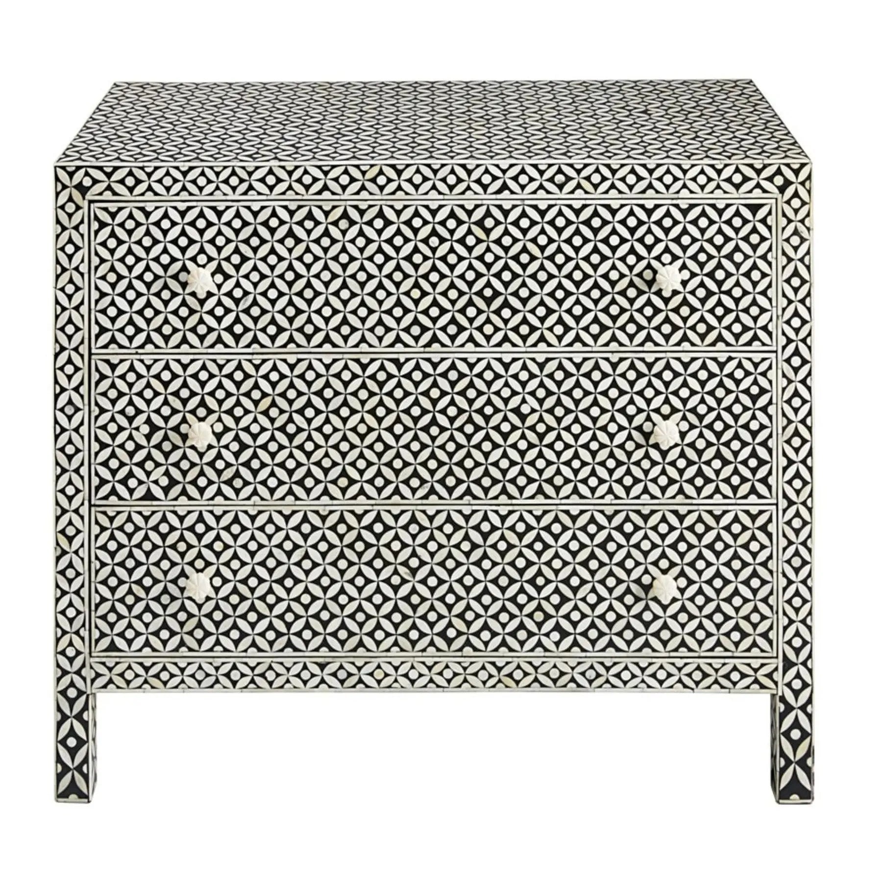This captivating chest of drawers is a unique possession piece to be smitten with for years to come and is even more picturesque in this large size. This multifaceted chest of drawers can be used in a living room, bedroom, entry, or hallway. It has 6 full-length drawers below, making it a flawless storage unit for a bedroom or living room. The bone inlay’s raveled design, coupled with the colorful resin background, allows this piece to add an exotic touch to any home décor. Made to Order. Thus, the customer owns a New Piece every time. This piece is hand-made by a skilled craftsman, slight irregularities in the resin and inlay may exist and because of this slight imperfections are to be celebrated and not considered to be flawed. The packaging of the product is done in a wooden box with proper cushioning to ensure that the product is delivered to you in its best condition. We use professional furniture packaging for the delivery of large furniture pieces.