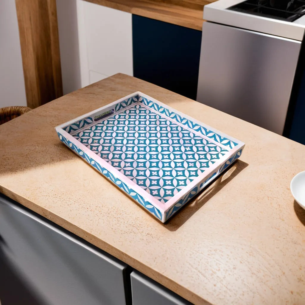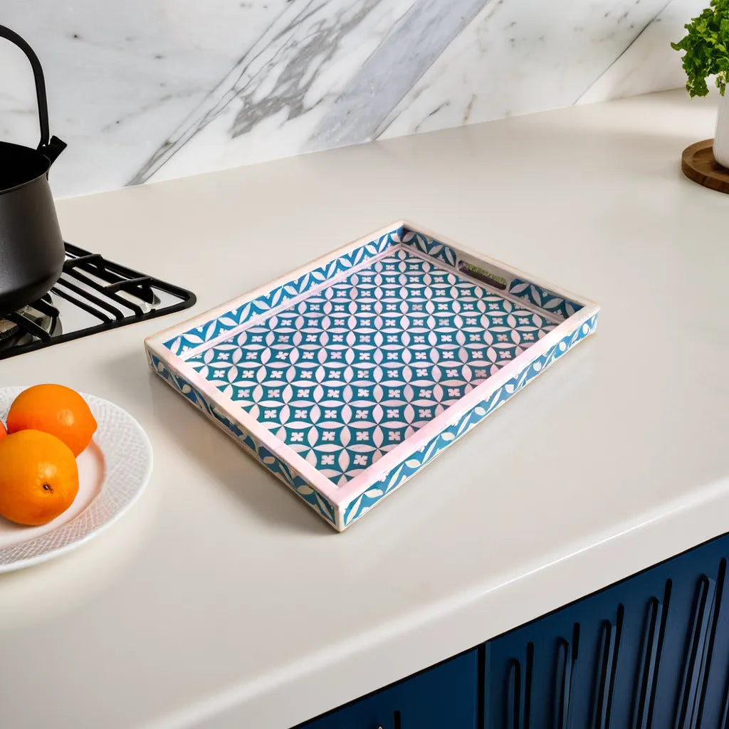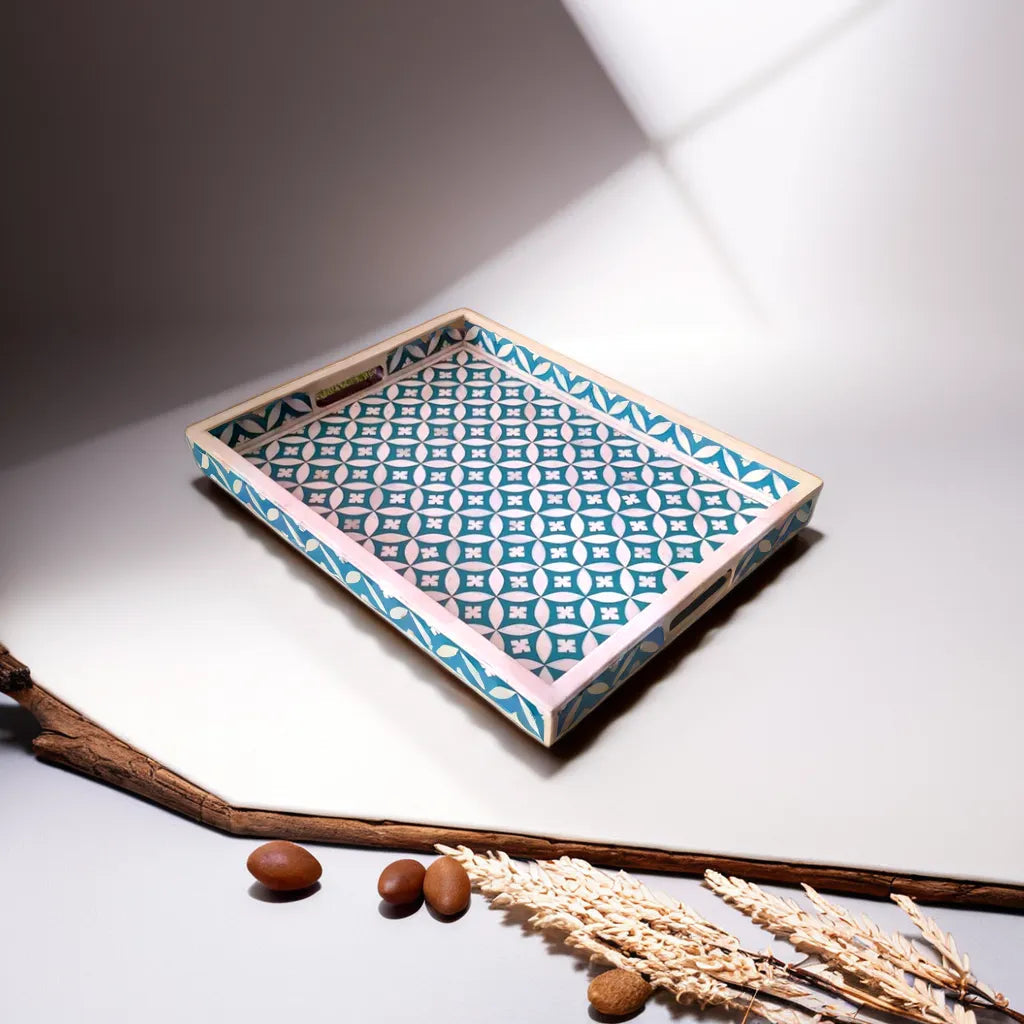 This bone inlay rectangular Tray is a perfect piece for serving food, drinks, or as the best gift article. Suitable for Office, Dining Table, Table Top, Bedside Table, Home Accents, Home, Hotel, Cafe and Restaurant Decoration, Multi-Purpose Organizer, Kitchen Serving Tray, Stationery Organizer, Office Table Organizer. This piece is hand-made by a skilled craftsman, slight irregularities in the resin and inlay may exist and it is the nature of this lovingly hand-made product. Use a damp cloth to wipe the stains on the product and let it air dry. Do not wash the product under running water.Â