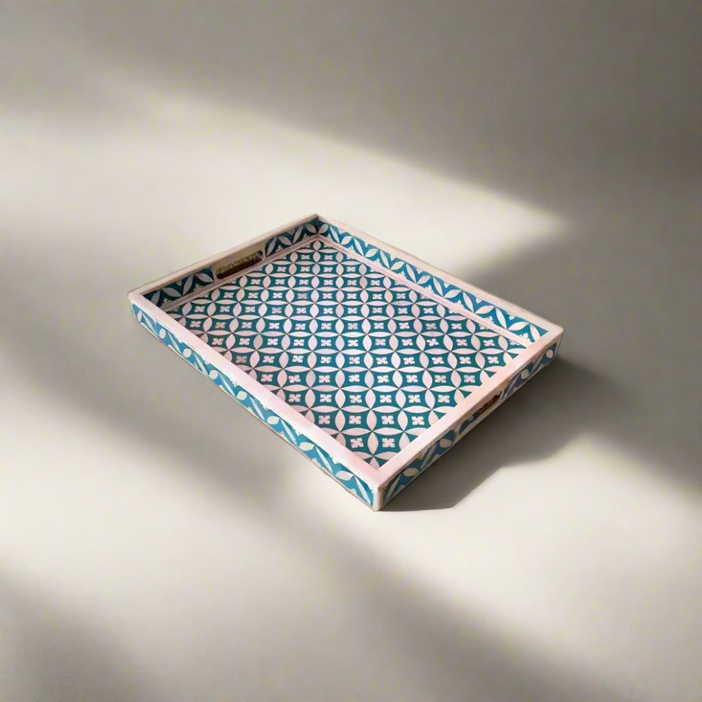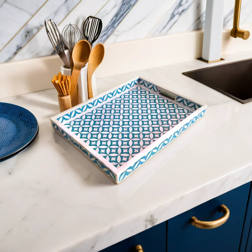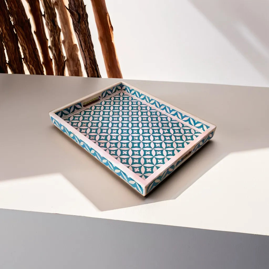 This bone inlay rectangular Tray is a perfect piece for serving food, drinks, or as the best gift article. Suitable for Office, Dining Table, Table Top, Bedside Table, Home Accents, Home, Hotel, Cafe and Restaurant Decoration, Multi-Purpose Organizer, Kitchen Serving Tray, Stationery Organizer, Office Table Organizer. This piece is hand-made by a skilled craftsman, slight irregularities in the resin and inlay may exist and it is the nature of this lovingly hand-made product. Use a damp cloth to wipe the stains on the product and let it air dry. Do not wash the product under running water.Â