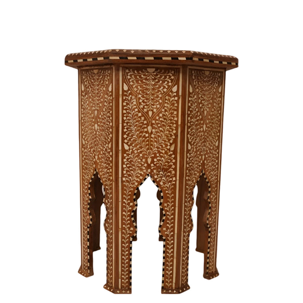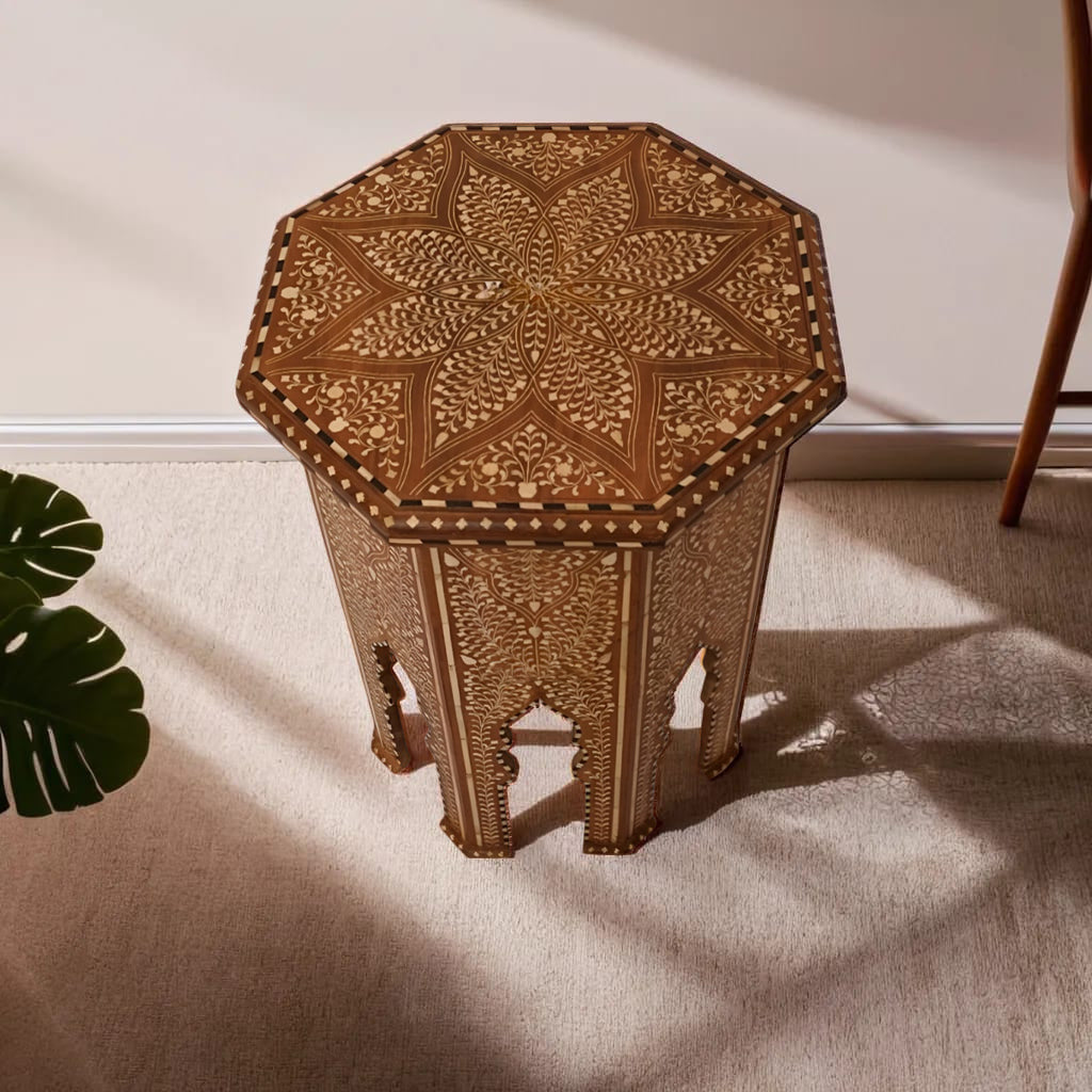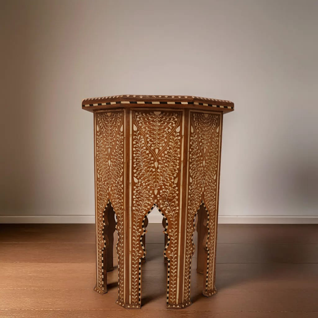 ◙ The stool is entirely handmade, beginning with the construction of its wooden frame. Artisans cut and carve the inlay chips into refined, intricate shapes. Each piece is then carefully affixed to the stool, creating an exquisite pattern.