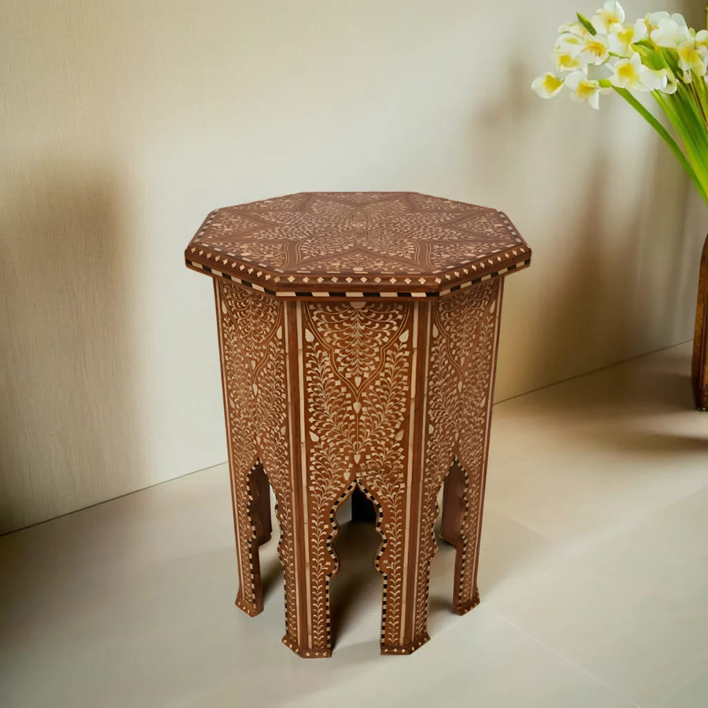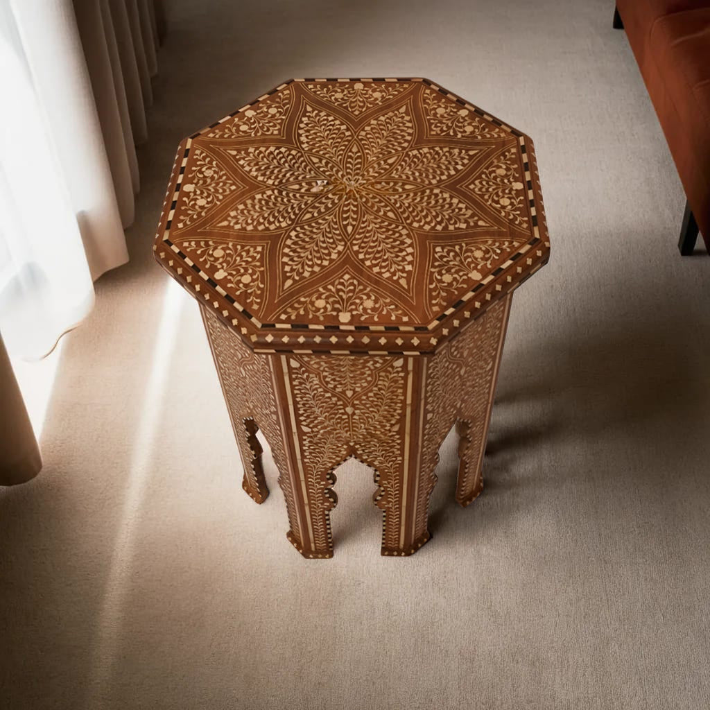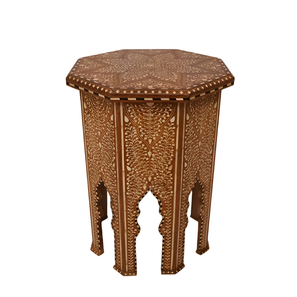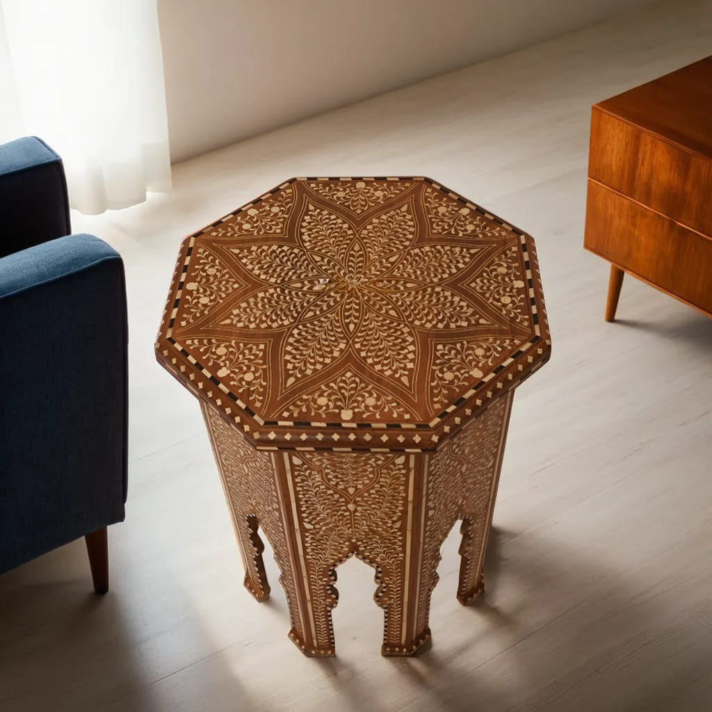 ◙ The stool is entirely handmade, beginning with the construction of its wooden frame. Artisans cut and carve the inlay chips into refined, intricate shapes. Each piece is then carefully affixed to the stool, creating an exquisite pattern.